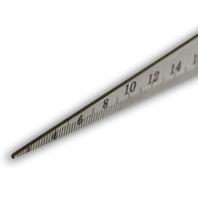 Der flache Messkeil aus Metall ist ein Instrument der Vermessungstechnik er wird zum Messen von Spaltmaßen, Nuten und Schlitzen eingesetzt. Der Metallmesskeil ist für den professionellen Einsatz der hohe Genauigkeit , eine lange Lebensdauer und hohe Belastbarkeit erfordert geeignet. Der minimale Wert beträgt 2mm, der maximale 26mm bei einer Auflösung von 0,2mm. Der Messkeil dringt in den Spalt so weit ein bis er die Breite ausfüllt (Voraussetzung ist die Spalttiefe ist ausreichend tief um den Messkeil aufnehmen zu können) über die Skala wird dann die Breite abgelesen.