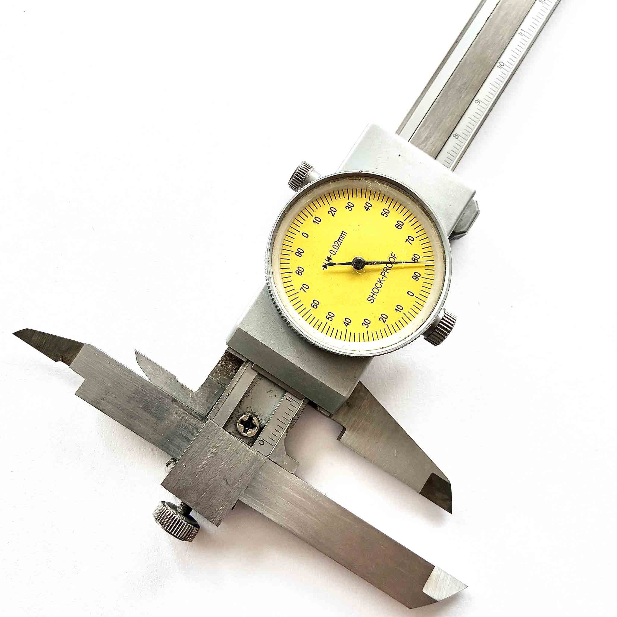 Der Messschieber kann durch seine Punktmessflächen auch sehr gut zum Anreißen benutzt werden. Der Uhrenmessschieber besitzt ein gelbes kontrastreiches Zifferblatt, eine geschützt liegende Zahnstange und ein Tiefenmaß, das zum Messen z.B. von Bohrlöchern benutzt werden kann. Am Gerät sind Feststellschrauben zum Festklemmen des Ziffernrings, am verstellbaren Messschenkel und der Messleiste vorhanden. Die Lieferung erfolgt im Holz-Etui.